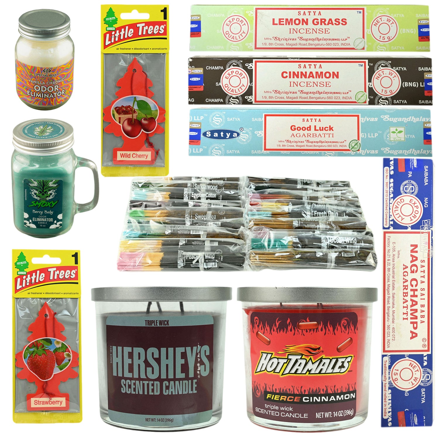 An assortment of odor eliminators, scented candles, incense sticks, and air fresheners, perfect for adding some great scents to any space. Explore a world of fragrance with our incense collection!